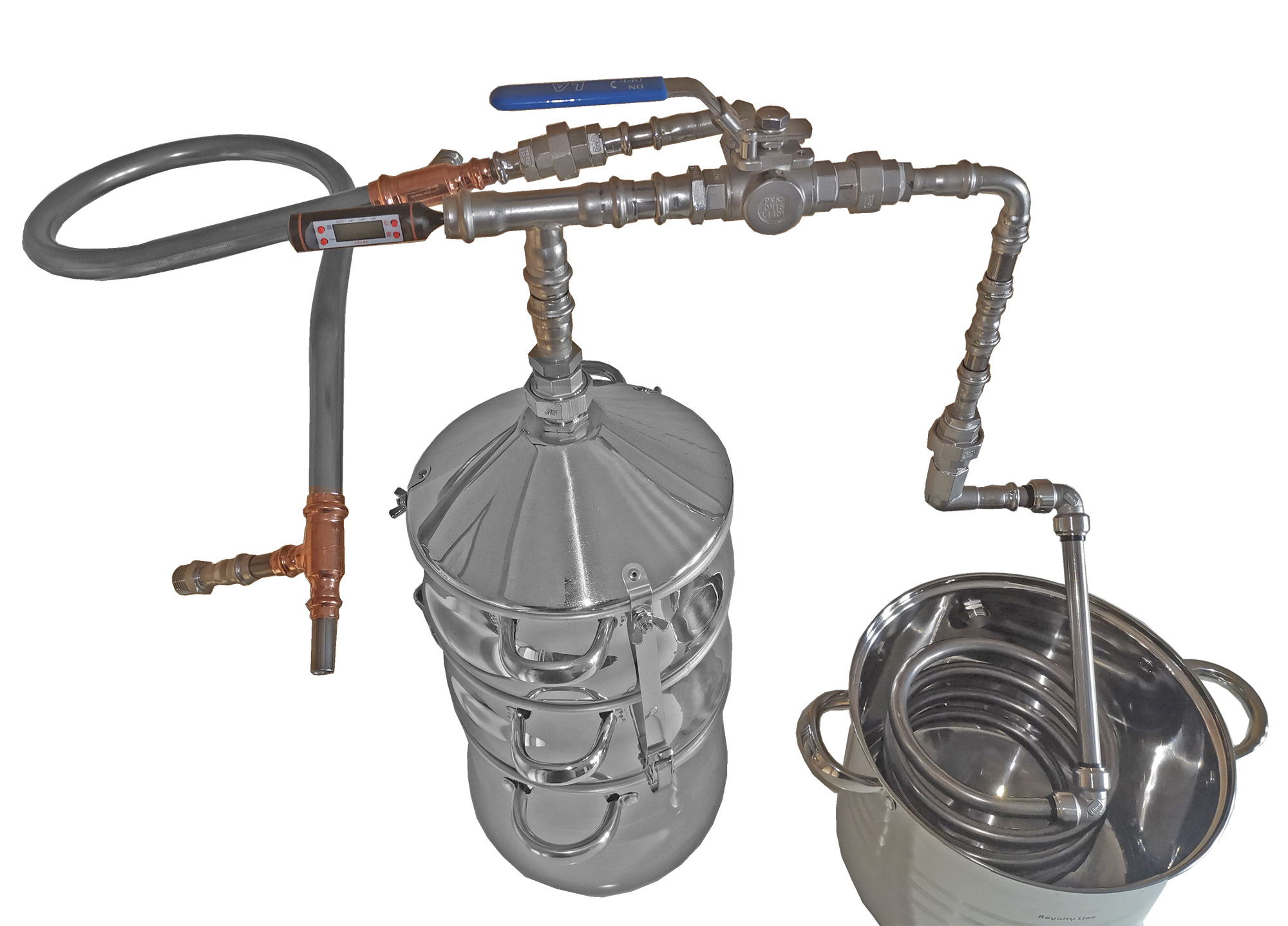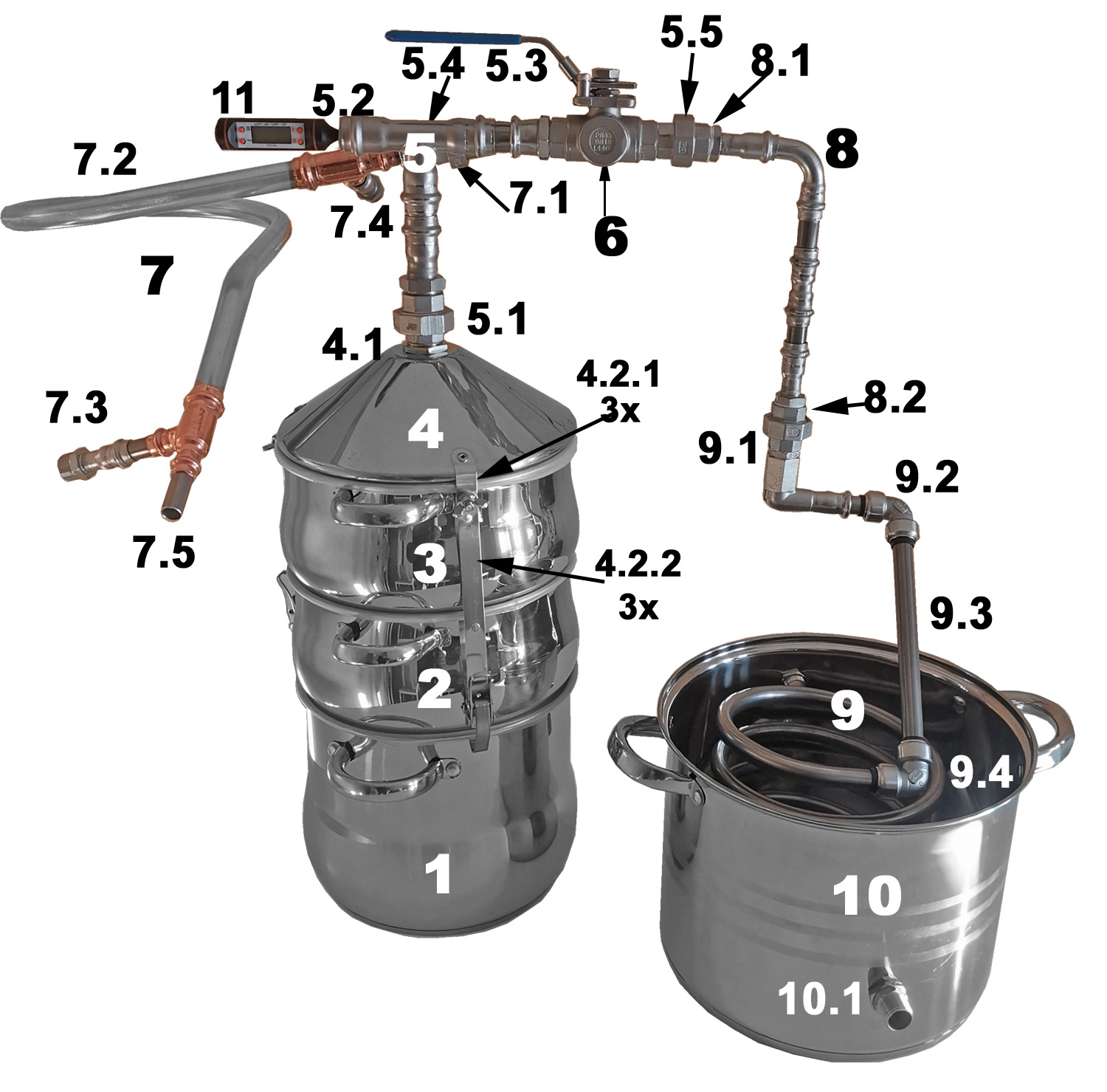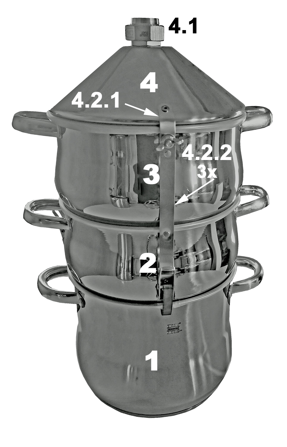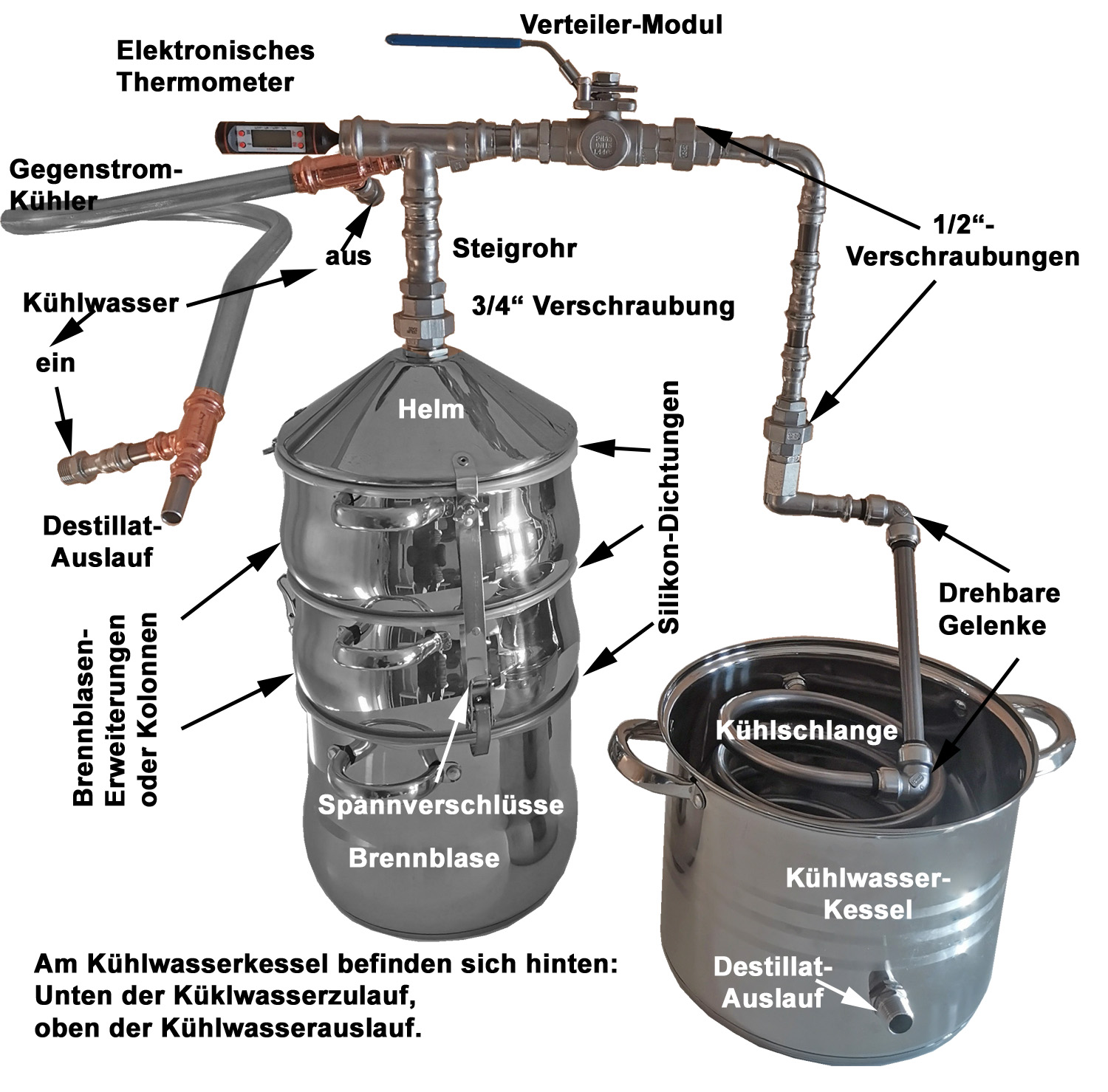 14 Liter Edelstahl-System incl. 2 befüllbarer Kolonnen (Obertopf / Aromakorb, 3 teilig) und Edelstahl-Destillieraufsatz mit 2-Wege-Kühlung