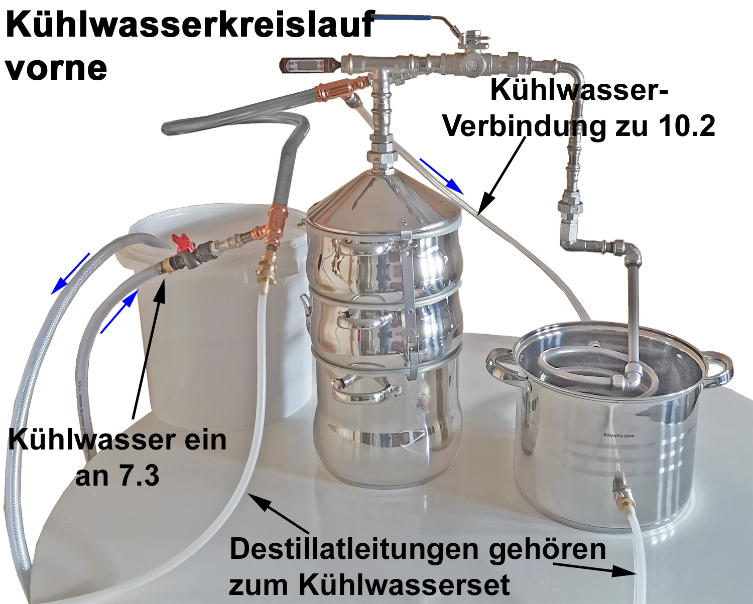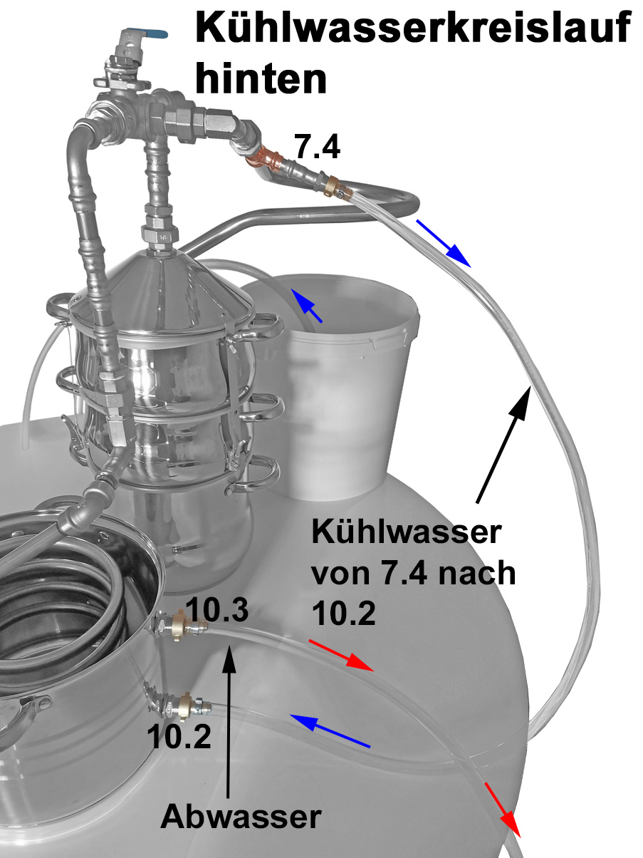 Damit die Destillation während der 2-Wegedestillation unterbrechungsfrei abläuft, stellt man am besten einen Kühlkreislauf her. Dieser besteht aus mindestens 4 Schläuchen. Entweder schließt man den 1. Schlauch direkt am Hauswassersystem an oder, wenn man hauswasserunabhängig arbeiten möchte, an eine Wasserpumpe in einem Kühlwasserreservoir. Wir haben zur Dokumentation den Wasserbehälter auf den Tisch gestellt. Wenn man das Kühlwasser in den Vorratsbehälter zurückführen möchte, stellt man diesen unter den Arbeitstisch auf, damit der Abflussdruck an 10.3 ausreicht.